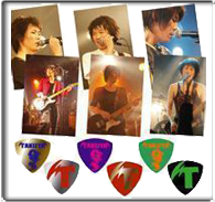 TAKUYAのlogoをあしらった、シルバー、ゴールド、レッド、バイオレット、グリーン、ブラックの6枚の特製ピックと、TAKUYAのポストカード6種をセットにしました。